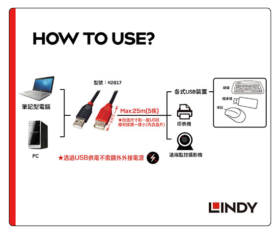 【上一個】【下一個】 | LINDY林帝 42817 USB傳輸線 2.0 A公-A母 5M串接~25M
