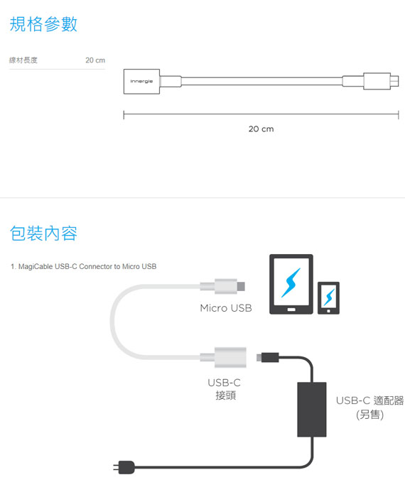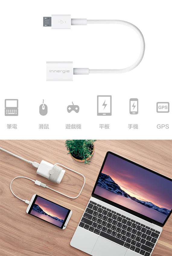 MagiCable USB-C Connector to Micro USB可完美搭配Innergie PowerGear USB-C 45筆電充電器,就可以直接轉換成Micro USB接頭快充移動裝置,如此方便快速的組合可以省去移動中攜帶多顆充電器的麻煩,尤其適合大部分Android手機使用