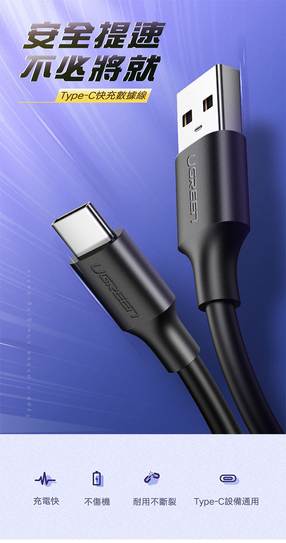 UGREEN綠聯 60117 黑色 Type-C USB傳輸線 A公-C公 1.5M
