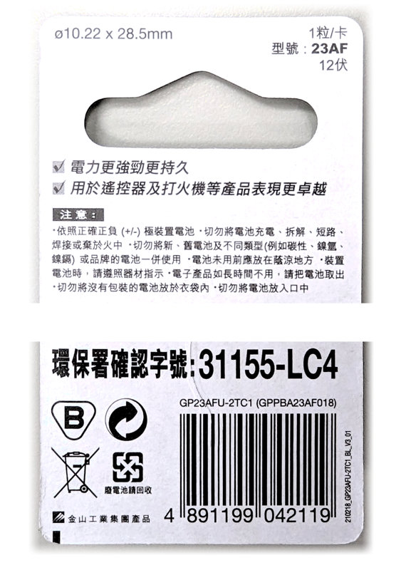 【上一個】【下一個】 | GP超霸 23A 12V遙控器專用電池 單包裝