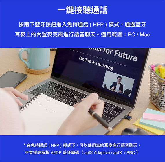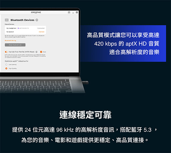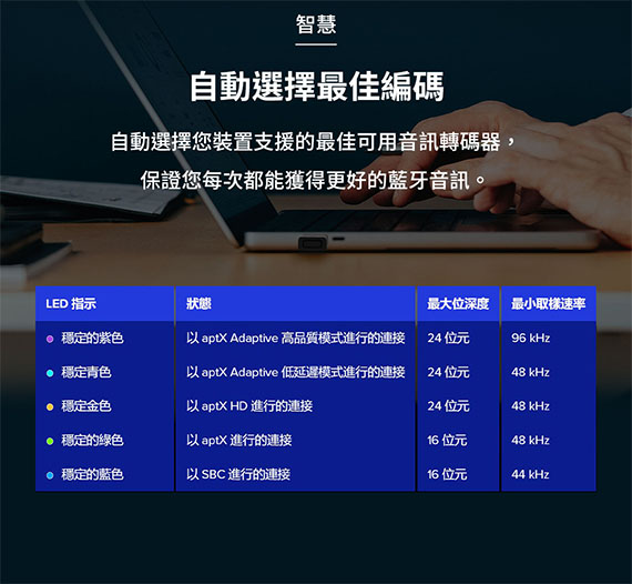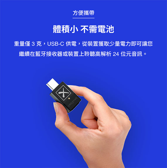 Type-C介面、藍牙5.3、支持的編解碼aptX Adaptive/ aptX HD/ aptX/ SBC、提供24位元高達96kHz的高解析度音訊、支援高達4台裝置、3克極輕重量