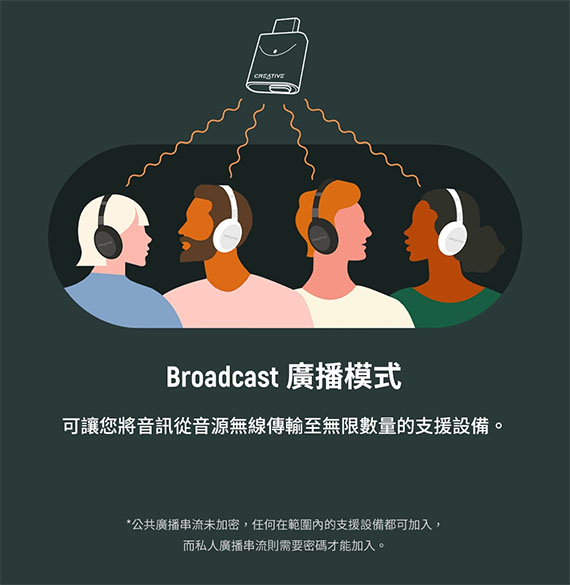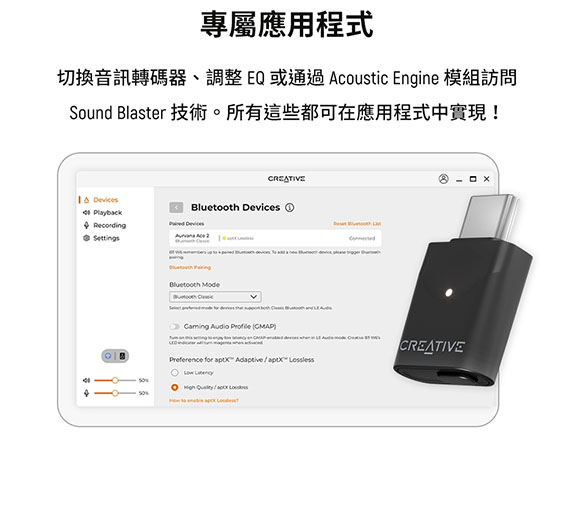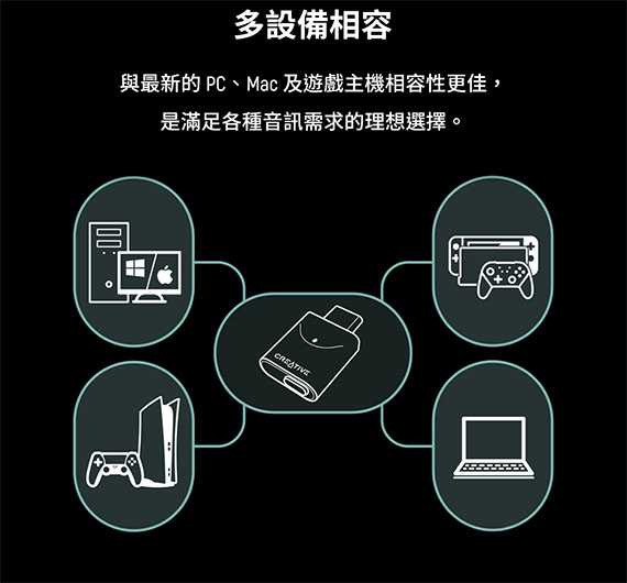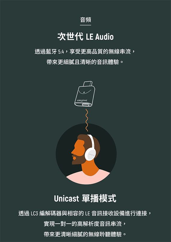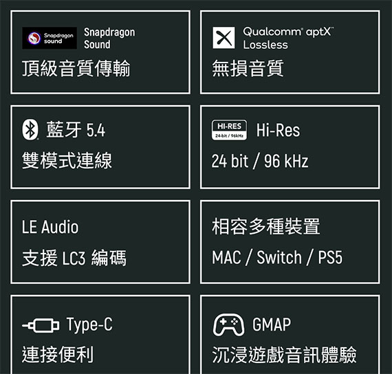 Type-C介面、支援藍牙LE Audio和經典藍牙5.4、無線傳輸範圍30m、採用高通Snapdragon Sound技術、支持音頻編解碼:aptX Adaptive/ aptX HD/ aptX Lossless/ aptX/ SBC/ LC3、相容 PC、Mac、PS5、Switch等裝置、提供24位元高達96kHz的高解析度音訊、單播和廣播模式