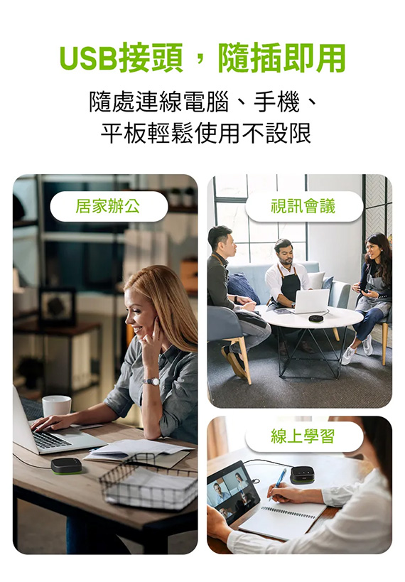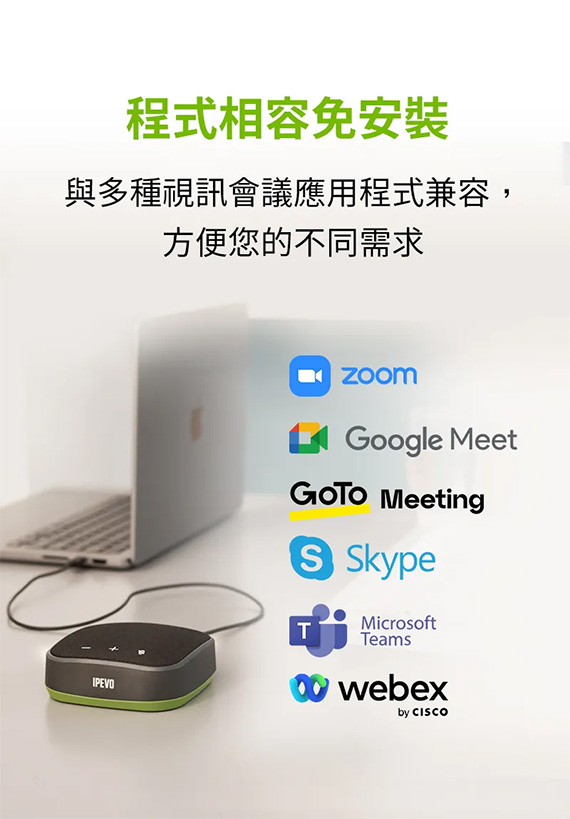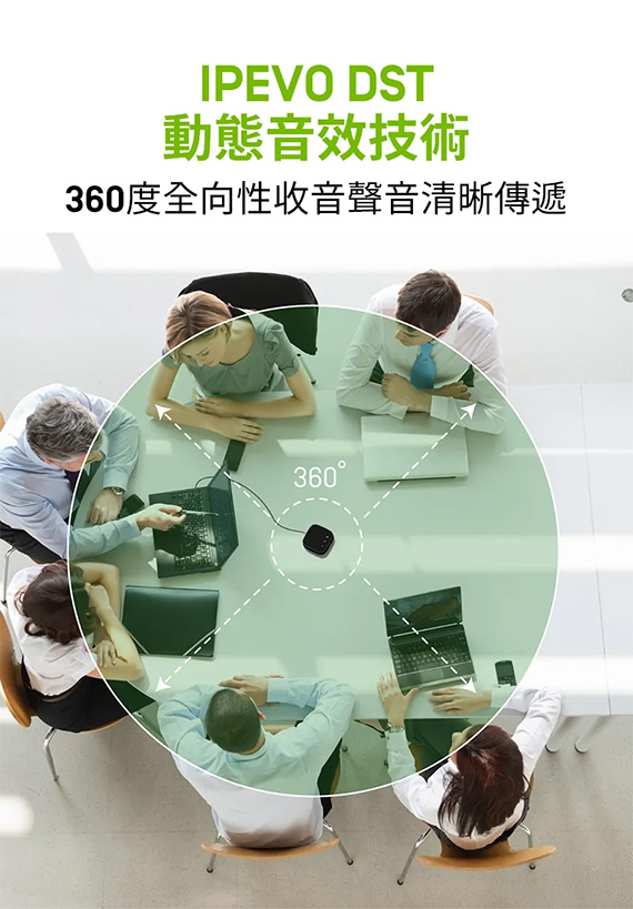 功率:5W, USB-C,0.68公尺,尺寸10.3x10.3x3.1公分,240g, 搭載360度全向性麥克風,聲音收音距離1.5公尺,搭載intelliGo AI人工智慧晶片,去除環境噪音,IPEVO DST動態音效技術,高品質的麥克風和沉浸式揚聲器,簡化了視訊會議設置,一鍵靜音,多種視訊會議應用程式兼容,便攜輕巧,附:收納袋,保固2年