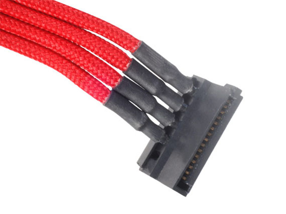 SATA 15pin線端*4<-->電源大4pin公,長度:80mm+80mm+80mm+80mm,線徑18AWG,延伸原有電源供應器線材長度,每條線材獨立包覆隔離網,相容所有電源供應器