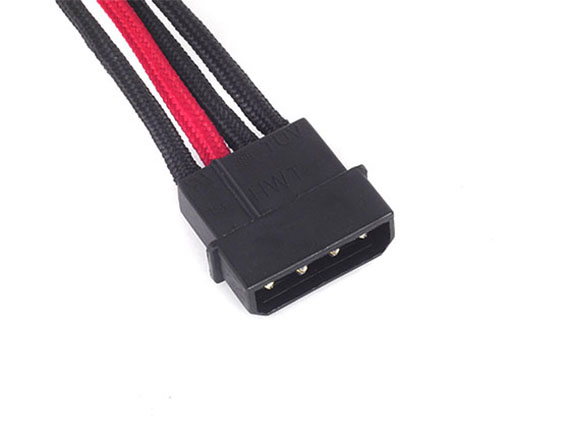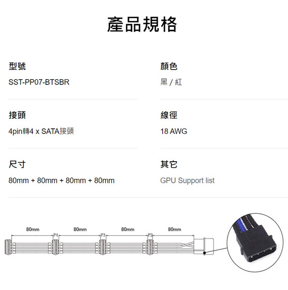 SATA 15pin線端*4<-->電源大4pin公,長度:80mm+80mm+80mm+80mm,線徑18AWG,延伸原有電源供應器線材長度,每條線材獨立包覆隔離網,相容所有電源供應器