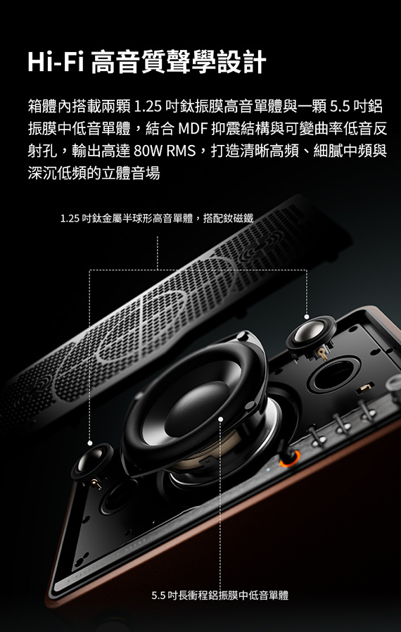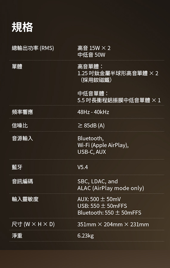 Hi-Res Wireless 金標認證,50W+15W×2 功率,支援 24bit / 96kHz 無損播放,藍牙 5.4,支援 LDAC / AAC,AirPlay2 無損串流,鈦質高音+鋁質低音單體,雙聲道+數位處理,專屬 EDIFIER Home App,頻率48Hz-40KHz