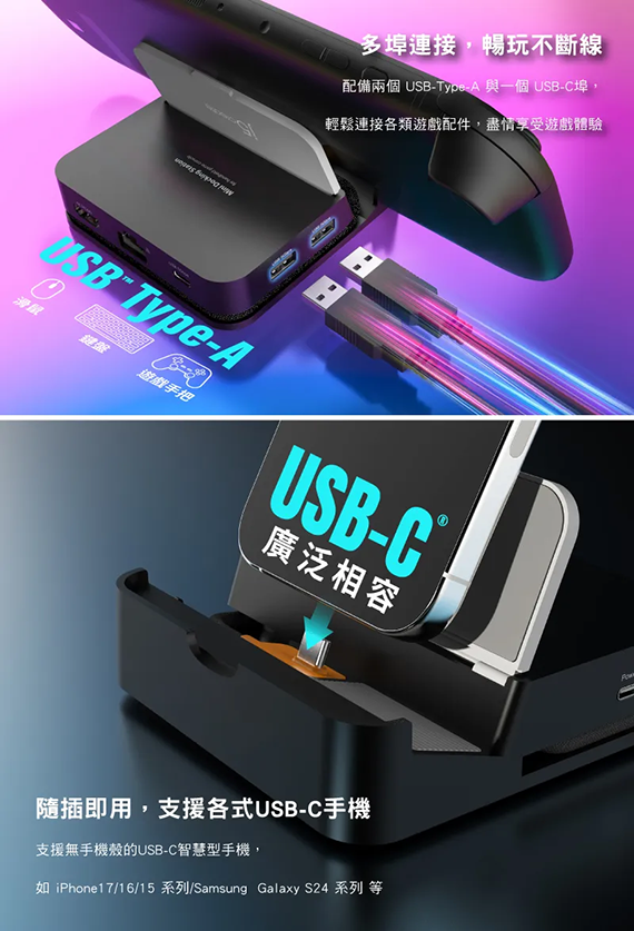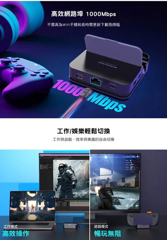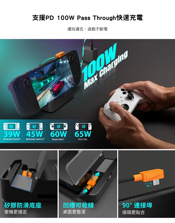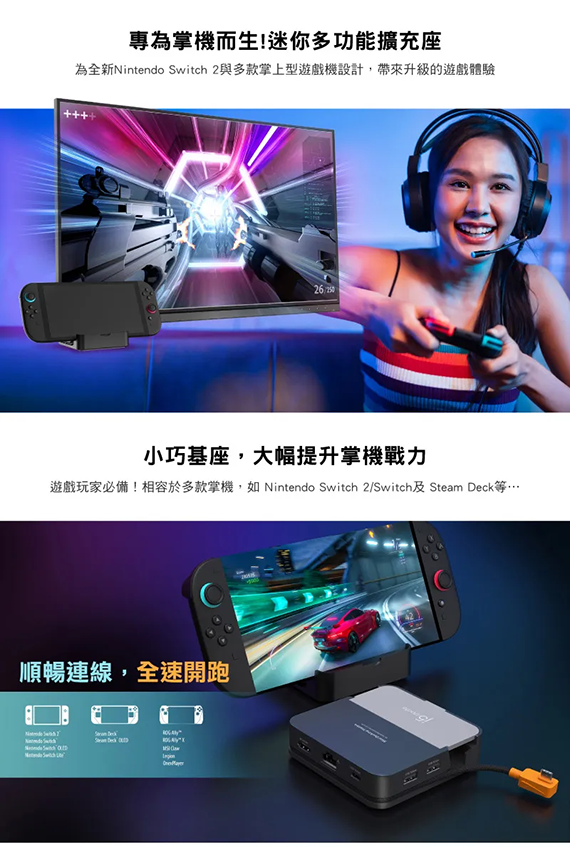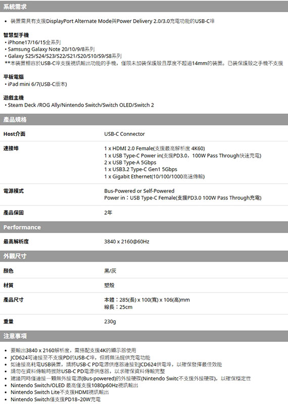 USB Type-C 介面,HDMI 2.0*1,USB Type-A *2,USB3.2 Type-C Gen1*1,Gigabit*1,最高解析度3840 x 2160@60Hz,可拆式連接線設計,適用於:Nintendo Switch一代/二代、Steam Deck、ROG Ally、智慧型手機、平板電腦,保固2年