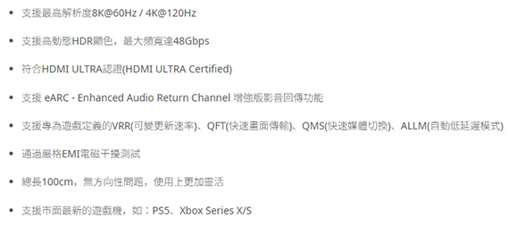 HDMI 2.1,A公19pin<-->A公19pin,線長:1公尺(1米)/100公分(100cm),支援最高解析度8K@60Hz/4K@120Hz,支援高動態HDR顯色,最大頻寬達48Gbps,支援eARC-Enhanced Audio Return Channel增強版影音回傳功能,支援專為遊戲定義的VRR(可變更新速率)、QFT(快速畫面傳輸)、QMS(快速媒體切換)、ALLM(自動低延遲模式),通過嚴格EMI電磁干擾測試