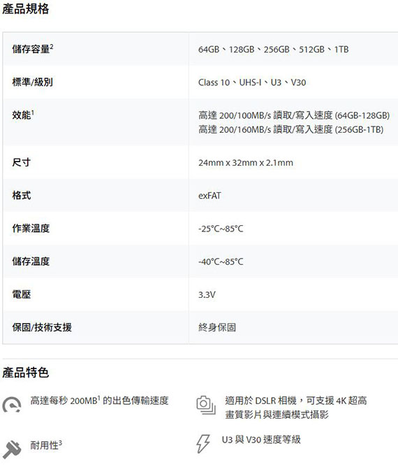 標準/級別:Class 10、UHS-I、U3、V30,高達200/160MB/s讀取/寫入速度,格式:exFAT,4K超高畫質影片錄製和連拍攝影,適用於 DSLR 相機,IEC/EN 60529 IPX7認證,終身保固