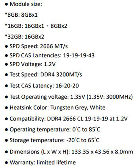頻率:DDR4 3200,針腳及模組:288-Pin U-DIMM,CL值:16-20-20,顆粒:1024*16(適用Intel第九代CPU以上),電壓:1.35V,自由變換 RGB 光效,支援 XMP 2.0 輕鬆超頻,支援最新 AMD 與 Intel 平台,終身有限保固