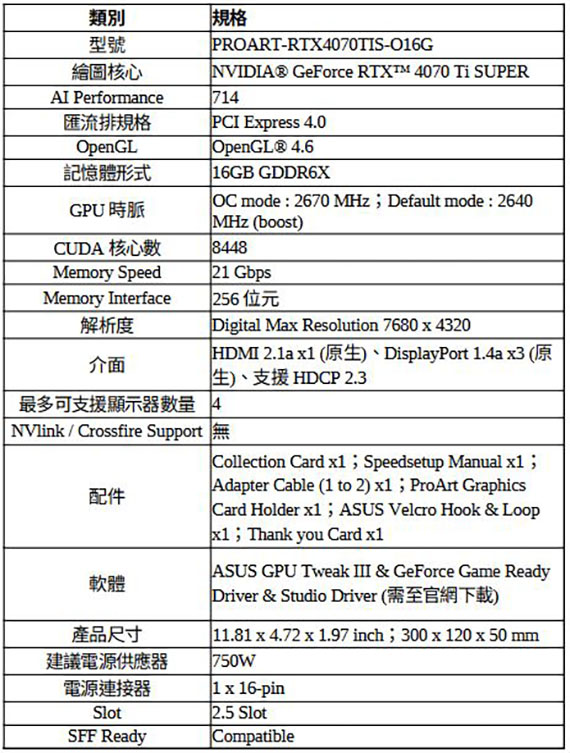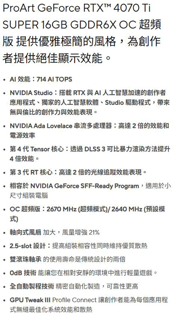 PCI-E 4.0,NVIDIA GeForce RTX 4070 Ti SUPER,16GB GDDR6X,256 位元,GPU時脈OC mode: 2670 MHz/Default mode: 2640 MHz,記憶體時脈(Gbps):30,介面:HDMI 2.1a*1/DisplayPort 1.4a*3,支援HDCP2.3,2.5 Slot,714 AI TOPS,NVIDIA Ada Lovelace 串流多處理器,第4代 Tensor 核心,第3代 RT 核心,軸向式風扇,雙滾珠軸承,0dB 技術,GPU Tweak III,3年保固