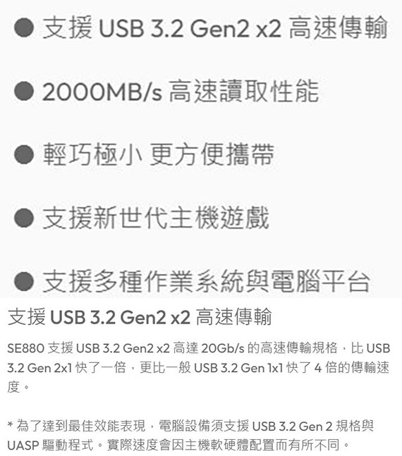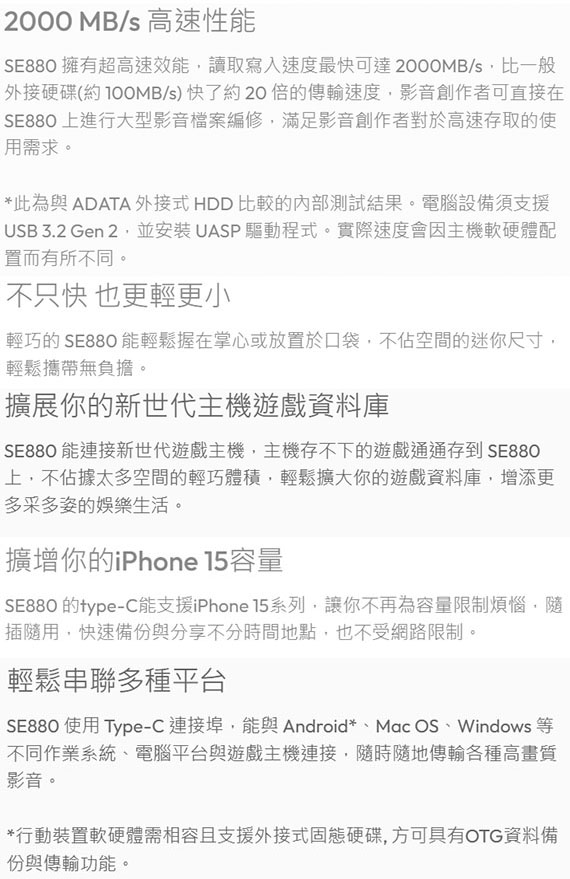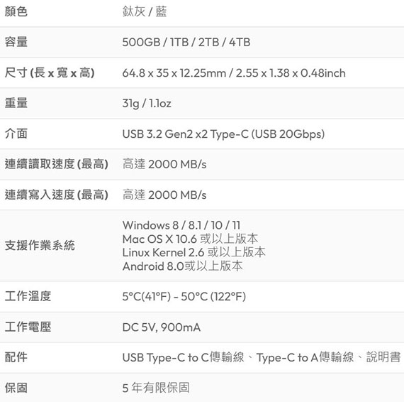Type-C USB3.2 Gen2 x2 (USB 20Gbps), 連續讀取速度高達2000MB/s,連續寫入速度高達2000MB/s, 支援擴增你的iPhone 15容量,隨插隨用快速備份, 能與Android、Mac OS、Windows...等不同作業系統、電腦平台與遊戲主機連接, USB3.2 Type-C to C傳輸線、Type-C to A傳輸線, 5年有限保固