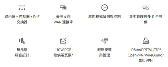 符合 IEEE 802.3 標準,介面:2*Gigabit SFP WAN/LAN,1*Gigabit WAN,1*Gigabit LAN/WAN,8*Gigabit LAN,三合一(集路由器、PoE 交換器和Omada控制器)功能為一身,雙核心CPU和1GB DDR3記憶體,110瓦PoE供電,集中管理,高度防護的VPN,適用於桌面和壁掛安裝,保固三年