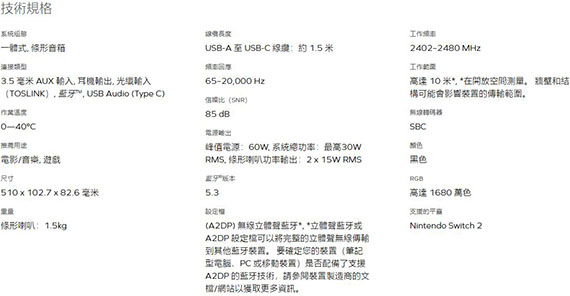 光纖輸入TOSLINK,藍牙5.3,3.5毫米,AUX輸入,耳機輸出,USB Audio(Type C),USB-A至USB-C線纜約1.5米,支援Nintendo Switch 2,遙控器,峰值功率60W,SUPERWIDE 技術,1 年有限硬件保固