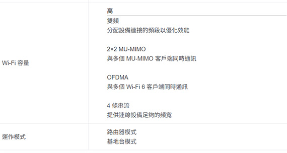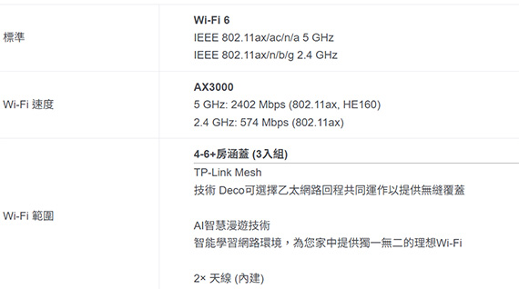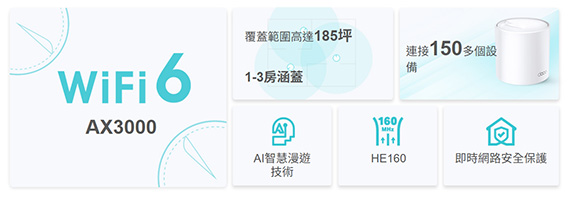 2.4GHz/5GHz頻段,最新的無線技術Wi-Fi 6,OFDMA/MU-MIMO技術,無線網路速度高達2976Mbps(2.4GHz 574Mbps+5GHz 2402Mbps),具備1-3房涵蓋(1-pack),覆蓋範圍高達185坪(3入組),連接150多個設備,HE160雙倍頻寬,TP-Link HomeShield,AI智慧漫遊技術,介面:Gigabit連接埠*3,1GHz雙核心CPU,Reset按鈕,尺寸(寬x深x高):110x110x114mm,三年保固 NCC認證碼: CCAH22LP0700T2 BSMI認證碼: D38330