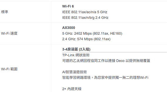 2.4GHz/5GHz頻段,最新的無線技術Wi-Fi 6,OFDMA/MU-MIMO技術,無線網路速度高達2976Mbps(2.4GHz 574Mbps+5GHz 2402Mbps),具備1-3房涵蓋(1-pack),覆蓋範圍高達185坪(2入組),連接150多個設備,HE160雙倍頻寬,TP-Link HomeShield,AI智慧漫遊技術,介面:Gigabit連接埠*3,1GHz雙核心CPU,Reset按鈕,尺寸(寬x深x高):110x110x114mm,三年保固 NCC認證碼: CCAH22LP0700T2 BSMI認證碼: D38330