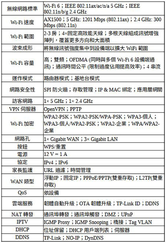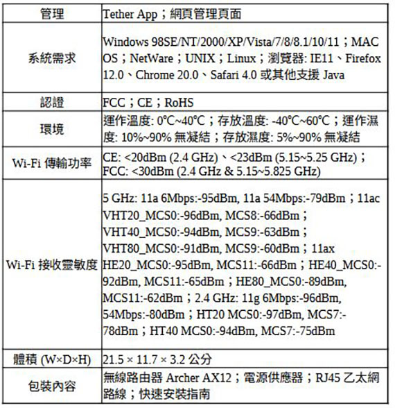 Wi-Fi 6技術。AX1500, 5GHz:1201Mbps(802.11ax), 2.4GHz:300Mbps(802.11n)。Wi-Fi 範圍2-3房,使用OFDMA和MU-MIMO技術將更多數據傳輸到更多設備,TP-Link Tether App幾分鐘內設定路由器。介面: Gigabit WAN*1埠, Gigabit LAN*3埠, 固定高效能天線*4, 12V/1A電源 NCC認證碼: CCAH23LP3980T2 BSMI認證碼: D38330