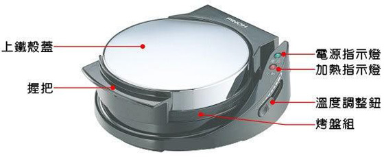 - 加熱指示燈:接上電源,指示燈會亮起,待約4~5分鐘後,指示燈會滅,表示預熱完成,即可倒入麵糊,再等指示燈二次熄滅了,就表示鬆餅烤好了