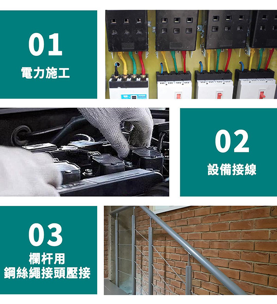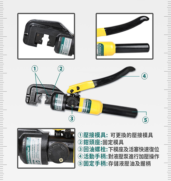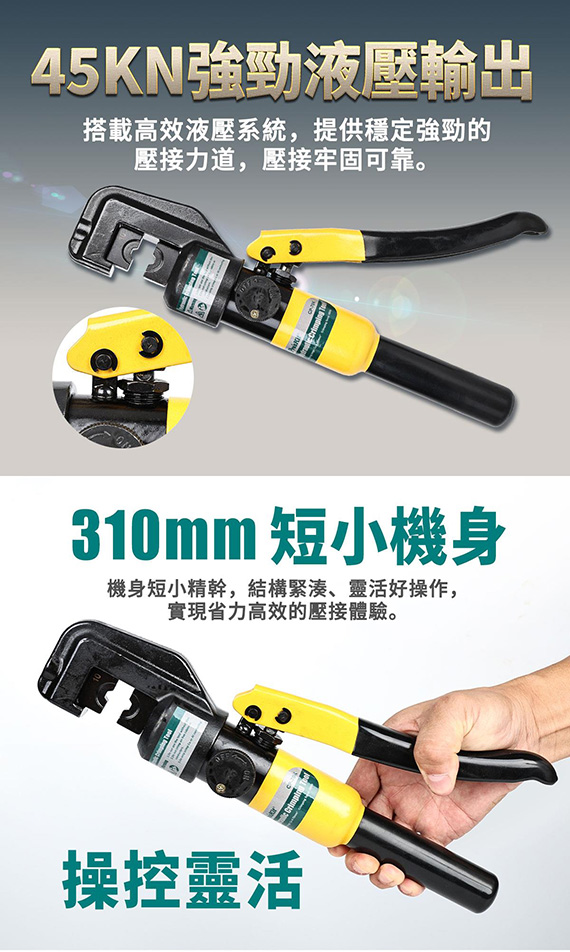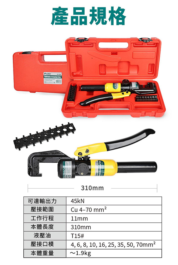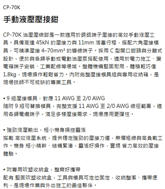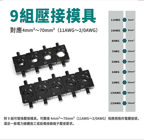 隨附9組可替換模具,支援11AWG至2/0AWG線徑範圍,高達45kN的壓接力與11mm活塞行程,可精準壓接4–70mm2的導線端子,C型開口鉗頭與分離式設計,附專用吹塑收納盒