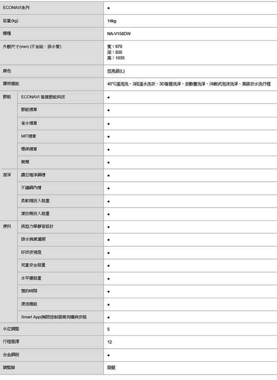 容量14kg,ECO NAVI智慧節能科技,3段溫水洗衣,3D智慧洗淨,沖刷式泡沫洗淨 ,高級衣水洗行程,40℃溫泡洗,自動槽洗淨 ,尺寸:寬 670 × 深 835 × 高 1,035 (mm)