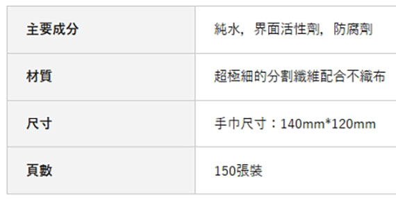 150張入、140x120mm、超極細分割纖維不織布材質、主要成分:精製水、界面活性劑、防腐劑、※本產品不適用於電漿電視或CRT螢幕