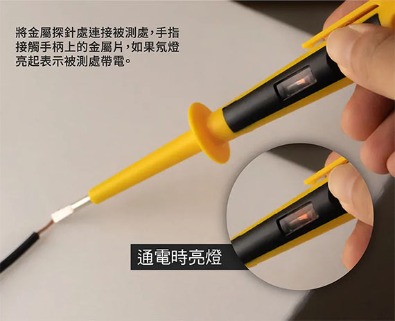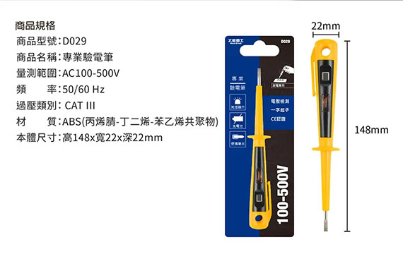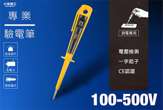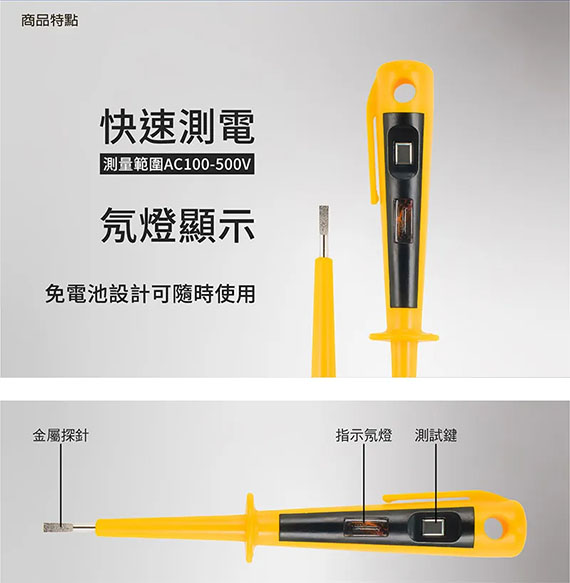 測試範圍:100-500V、氖燈顯示、免電池、便攜筆夾、電壓檢測/一字起子/CE認證