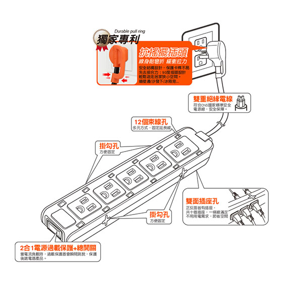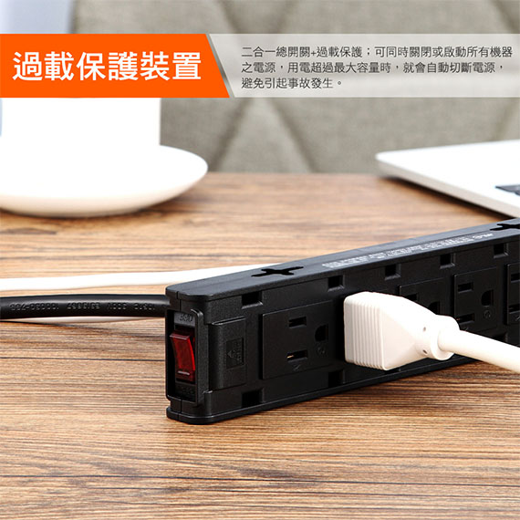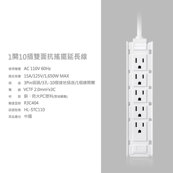 三孔,一開關十插座,線長:1公尺(1米)/100公分(100cm),專利抗搖擺插頭設計,額定容量:15A/125V/1650W,線材採用VCTF 2.0mm2粗電線,12個束線孔設計,過載保護開關,防火PC材質插座 BSMI認證碼: R3C404