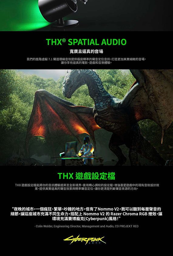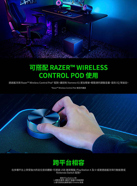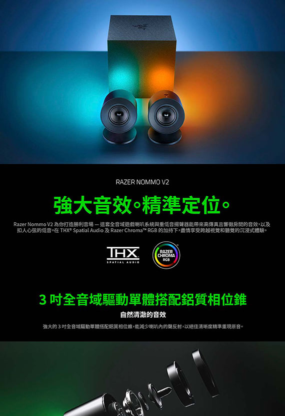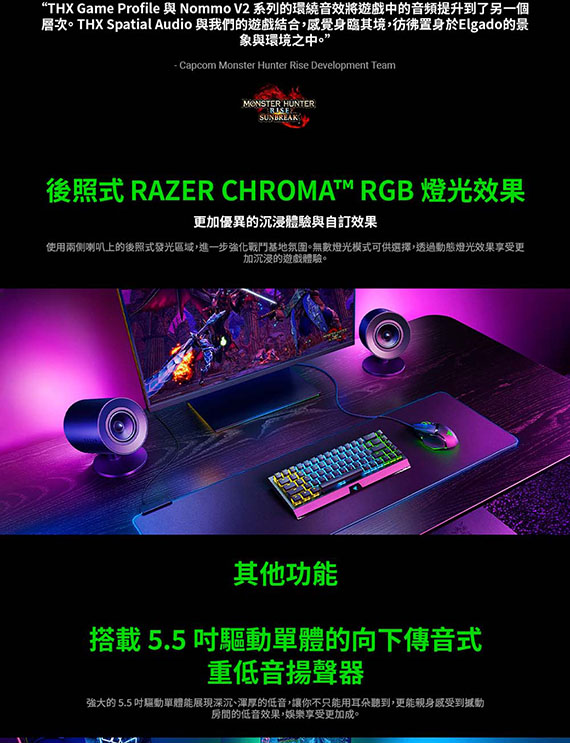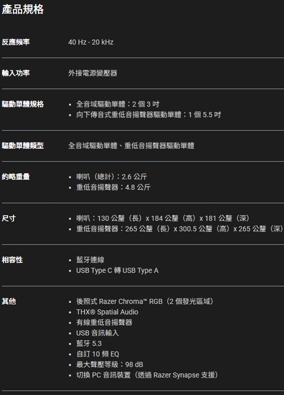 三件式2.1聲道,2個3吋全音域,1個5.5吋向下傳音式重低音,藍牙Bluetooth 5.3, USB Type C轉USB Type A。後照式Razer Chroma? RGB燈光效果, THXR Spatial Audio進階虛擬7.1聲道環繞音效,1年保固
