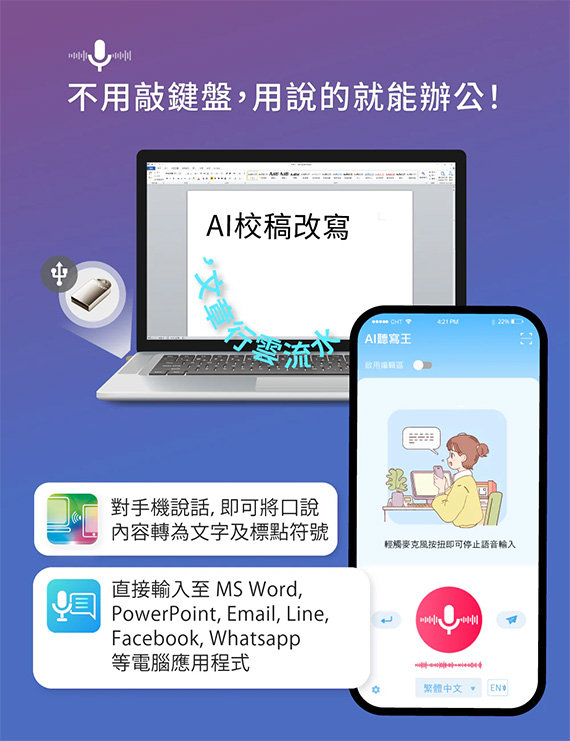 語音輸入文字到電腦、AI潤稿、AI翻譯聊天、蒙恬AI助理、多語翻譯、USB內建軟體免電腦安裝