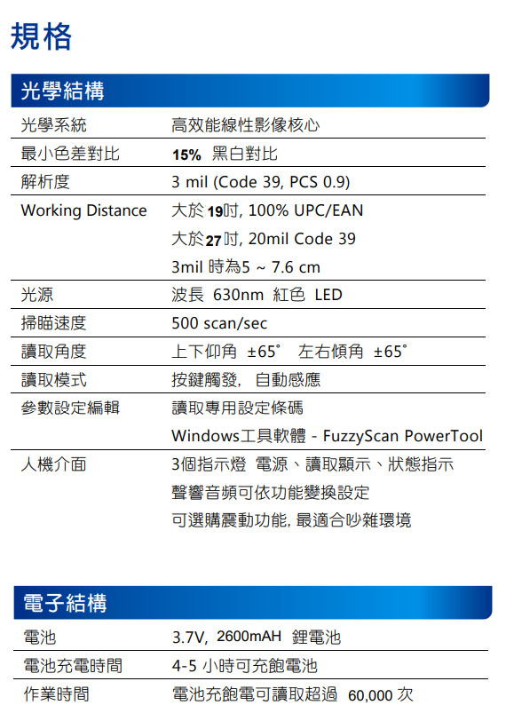 一次充飽電: 可供應執行約 60,000 次的掃描電力