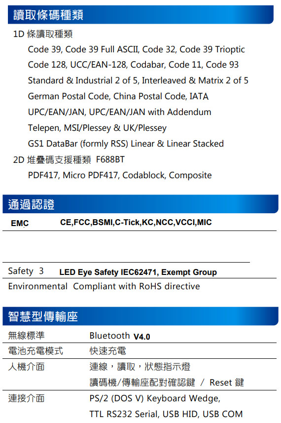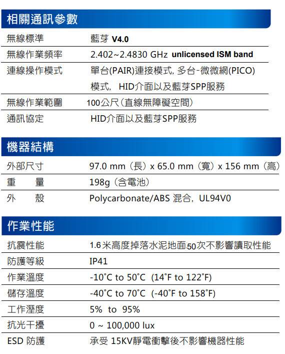 藍牙 Bluetooth 2.1 EDR無線技術傳輸距離達80m,智慧型的基座(兼具充電座)功能,支援高達七支條碼掃描器在單一基座裡的群組連接,支援SPP Matser/Salve 及 HID Keyboard Profile 鍵盤裝置功能,提供記憶儲存能力, Batch Scanning, 及Out of Range Scanning,達約兩萬筆讀取記憶(Ean 13碼),高達3mil高解析度的條碼讀取,支援 GS1 DataBar 線性堆疊碼,PDF,MicroPDF,及複合式條碼的讀取
