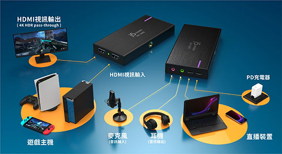 USB-C 3.2 Gen1介面、輸出:HDMI*1、3.5mm*1、輸出:HDMI*1、支援超低延遲4K@30Hz無壓縮影像抓圖擷取、支援4K@60Hz HDR直通、支援1080p@120 FPS高更新率圖片抓取、支援Type-C PD 60W直通充電、雙1/4”腳架孔可轉接冷靴座增加外接設備、支援UVC、支援多款直播軟體,包括OBS、Wirecast、XSplit、Adobe Flash Media、Live Encoder…等、相容多款遊戲主機,如PlayStation 4/5、Xbox Series X/S、Xbox One X/S、高品質鋁合金外殼、台灣製造