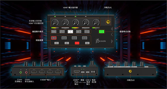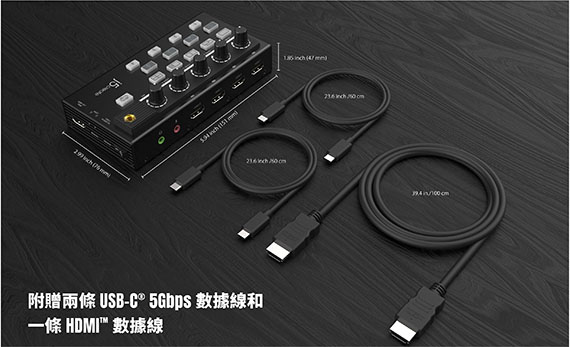 具備4路HDMI™訊號輸入,支援5種畫面顯示模式。支援USB-C® 3.2 Gen1與HDMI™ 1.3a,可擷取錄製最高1080P@60fps畫質。支援HDMI™ 1080p@60視訊輸出(PGM輸出)。內建5種畫面顯示模式:單畫面、子母畫面(PIP)、雙畫面(PBP)、4分割畫面(1大3小螢幕)、4畫面全螢幕分割。提供8個畫面切換按鈕與一個Return切換鈕,可達成快速切換畫面與模式記憶功能。提供5個音量控制旋鈕,可分別控制4個HDMI™與3.5mm音源輸入孔的音量。內置雙1/4”螺孔設計,方便轉接冷靴座固定於影音設備上。支援UVC,免驅動即插即用。具備LED指示燈顯示狀態(HDMI™輸入/USB™連接/音量大小/模式選擇)。支援Windows、Mac、Linux,並支援Android手機搭配直播App進行直播。支援多款直播軟體,包括OBS、Wirecast、XSplit、QuickTime、CameraFi™ Live…等。適用個人影音直播、活動轉播、直播帶貨、商務會議…等多種場景。高品質鋁合金外殼,兼具質感與耐用。