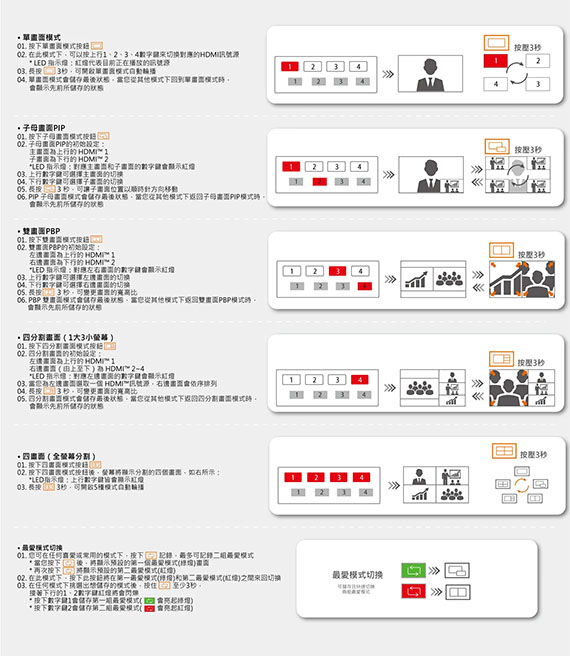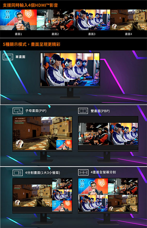 輕鬆切換多種畫面 精彩不錯過提供5種畫面顯示模式:單畫面、子母畫面(PIP)、雙畫面(PBP)、4分割畫面(1大3小螢幕)、4畫面全螢幕分割