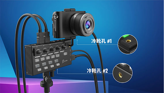 具備2個標準冷靴孔,攝影設備輕鬆架設可輕鬆固定於標準三腳架上,並可同時額外架設其他設備,讓你直播環境架設更容易