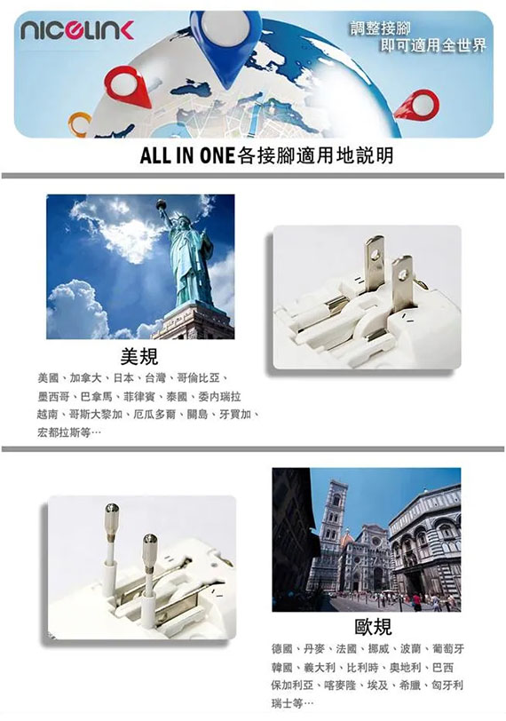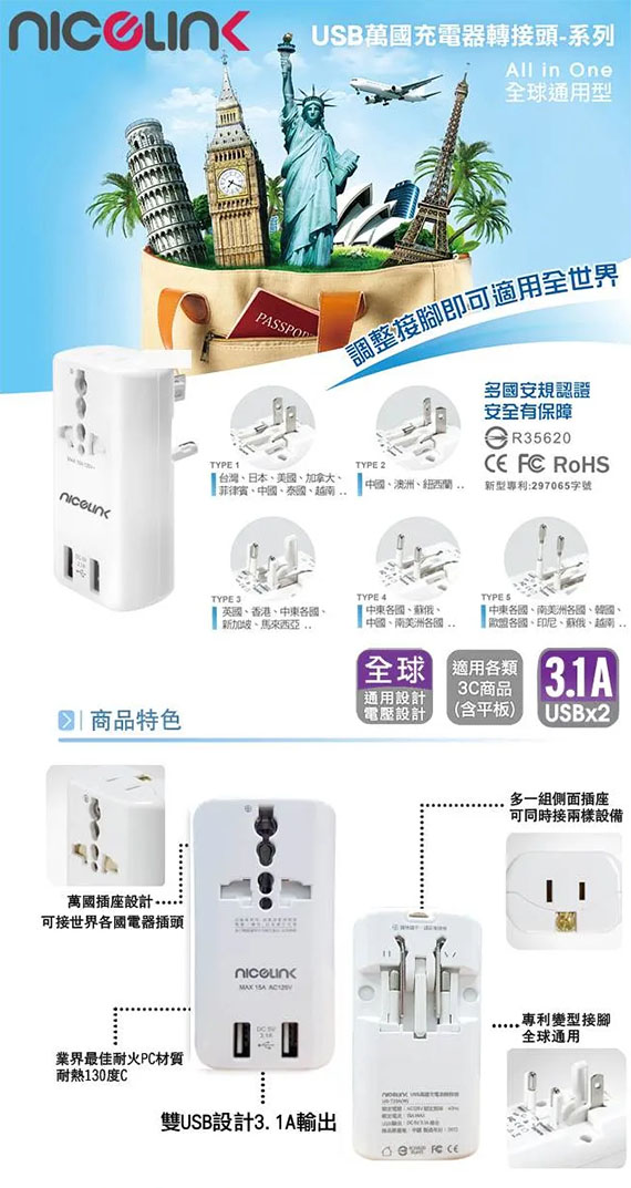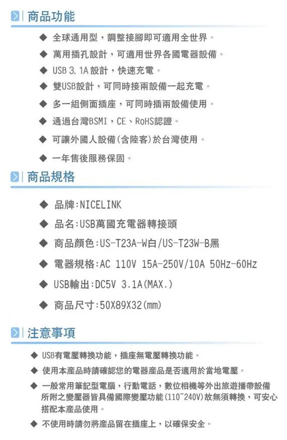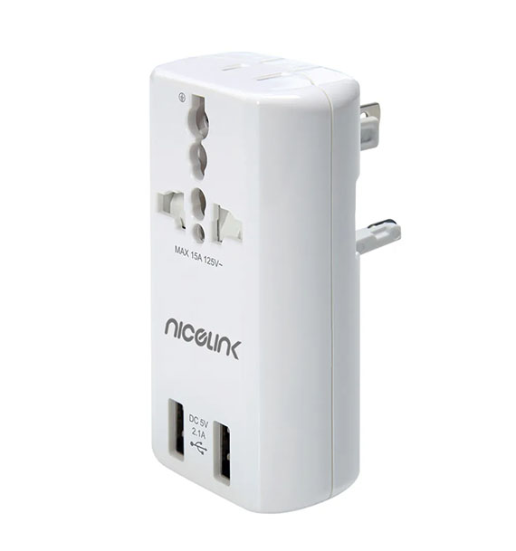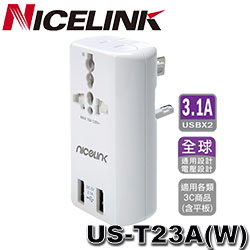 【上一個】【下一個】 | Nicelink US-T23A(W) 白色 旅行萬用轉接頭 +USB充電*2(3.1A) (全球通用)