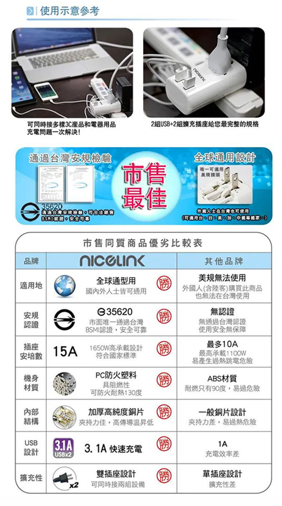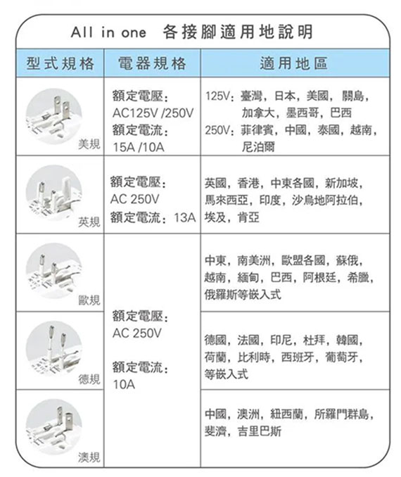 萬用插孔設計,調整接腳即可適用全世界,AC 110V 15A ~ 250V 10A, USB充電座*2埠 DC 5V 3.1A