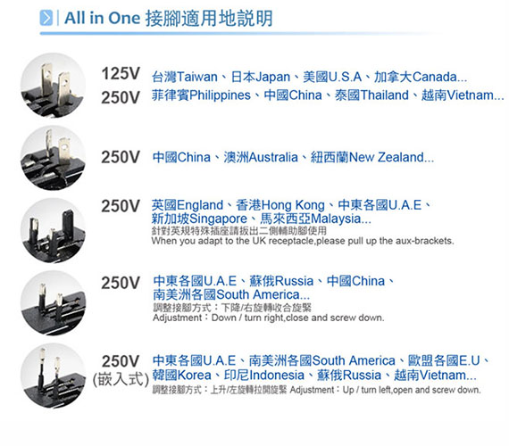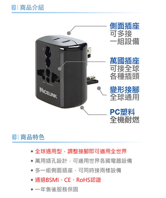 多一組側面插座,可同時接兩樣設備,AC 110V~250V 50Hz~60Hz, 15A/10A, 全球通用,萬用插孔設計,調整接腳適用世界各國電器設備,產地中國,一年保固