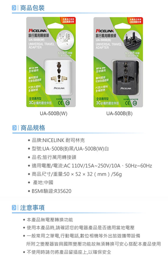 【上一個】【下一個】 | Nicelink UA-500B(W) 白色 旅行萬用轉接頭 (全球通用) (SAMPO EP-UA2C 可參考)
