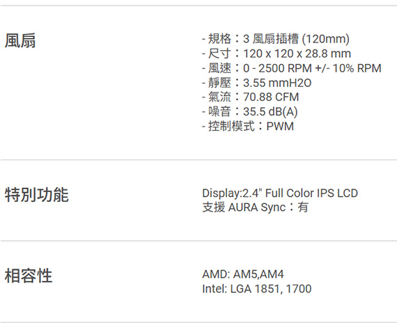 CPU腳位:Intel:LGA 1851/1700,AMD:AM5/AM4,內建風扇:AYW ARGB,風扇尺寸:394 x 120 x 27 mm,風速:0-2500RPM+/-10% RPM,風量:70.88CFM,噪音:35.5dB(A),靜壓:3.55mmH2O,散熱器尺寸(含扇):394x120x27mm,2.4吋全彩IPS LCD螢幕,預裝的串聯式ARGB風扇, 提供高風量與高風壓、維持低噪音運轉,高效能幫浦可提供高流量、低阻抗的穩定散熱,保固6年(90RC0162-B0TAY0)