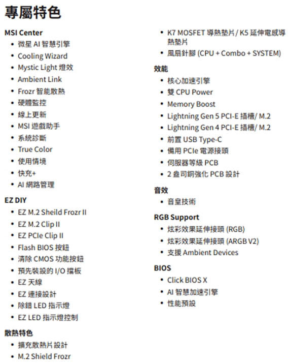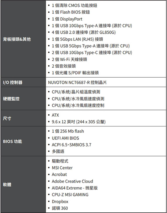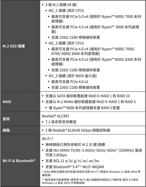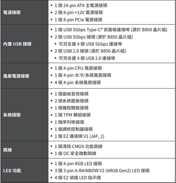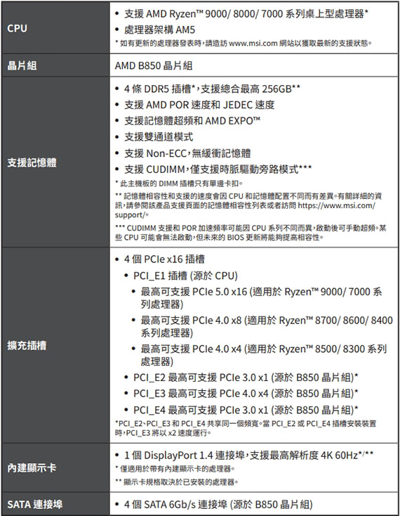 AMD B850、4*DDR5 8200+、4*PCIe x16、3*M.2、4*SATA6Gb/s、1*DisplayPort、Realtek 5G、WiFi 7、介面:4*USB2.0/1*USB 5Gbps Type-A/1*USB 10Gbps Type A/2*USB 10Gbps Type C、Realtek ALC897 7.1、ATX、需搭配CPU晶片才能使用內顯功能