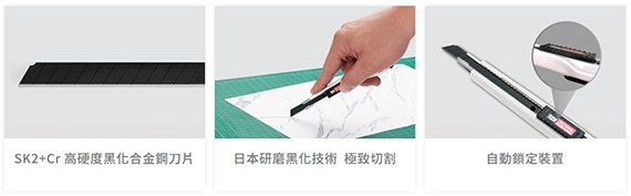自動鎖定裝置、SK2+Cr 高硬度黑化合金鋼刀片,強化耐用度、日本研磨黑化技術,實現極致切割。