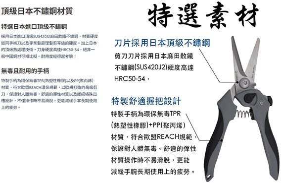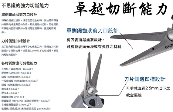 超省力剪刀力矩設計,一體成型的超耐用手柄設計,特選日本進口頂級不鏽鋼,刀片側邊凹槽設計,單側鋸齒狀剪刀口設計,手柄寬度可調整,兩種模式,快速鎖定裝置,三年保固