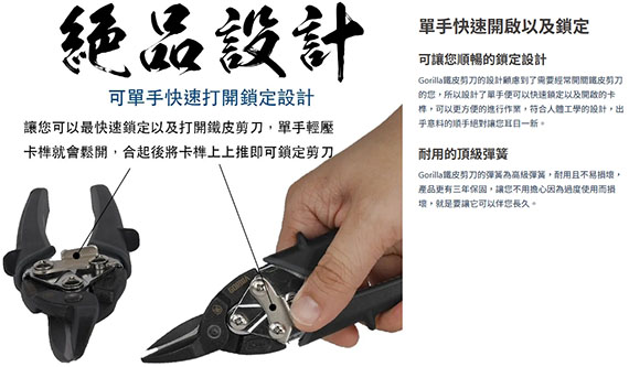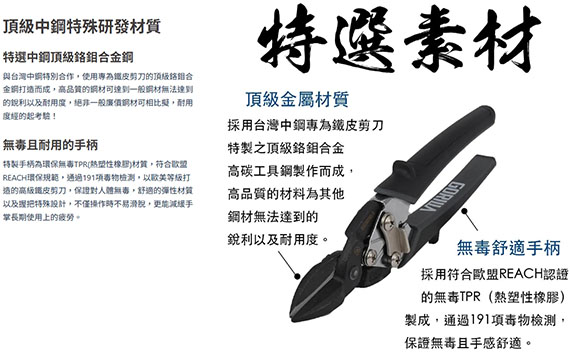 超省力力矩設計,強力直剪,特選中鋼頂級鉻鉬合金鋼,無毒且耐用的手柄,單手快速開啟以及鎖定,三年保固