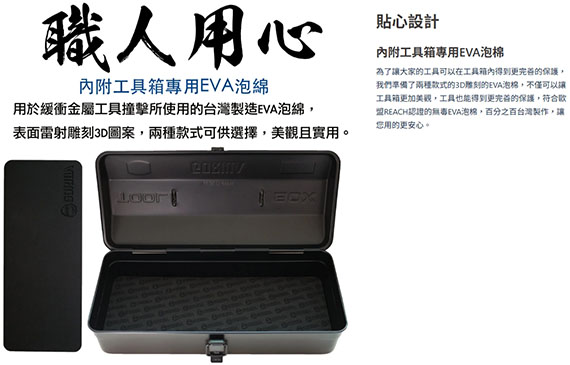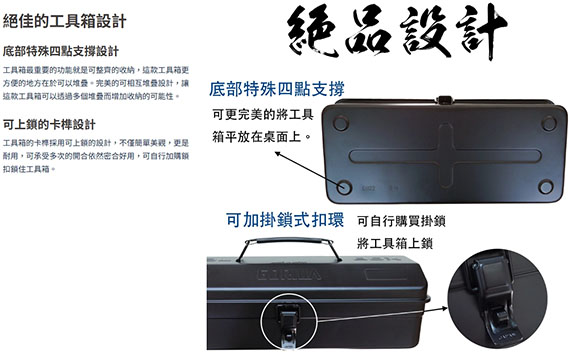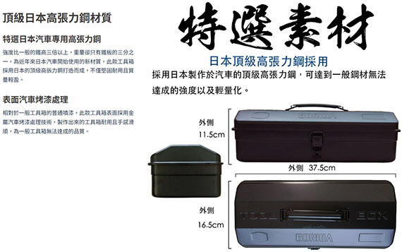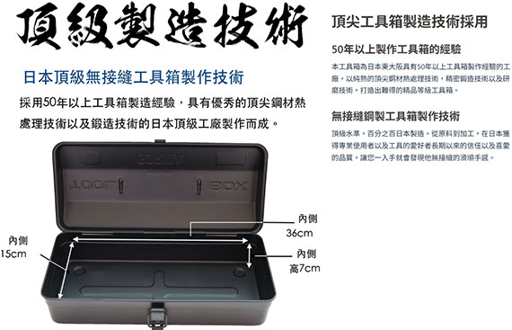 日本頂級工廠製作,霧黑色的紳士質感,日本汽車專用高張力鋼,表面汽車烤漆處理,無接縫鋼製工具箱製作技術,底部特殊四點支撐設計,可上鎖的卡榫設計,日本製造,尺寸:外徑:長37.5.x寬16.5x高11.5cm ,內徑:長36x寬15x高7cm