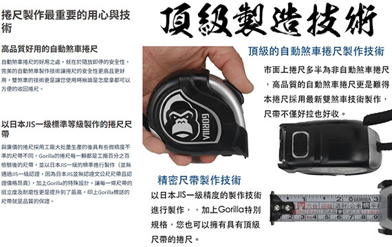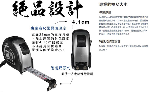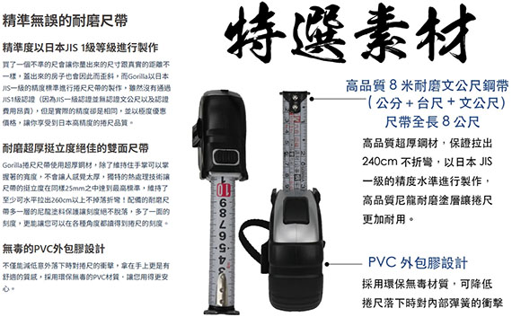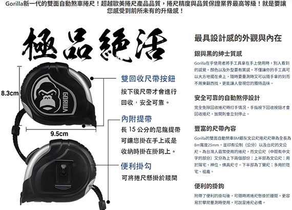 【上一個】【下一個】 | GORILLA 雙面自動煞車 8M25mm 銀灰 文公尺捲尺 004-G018