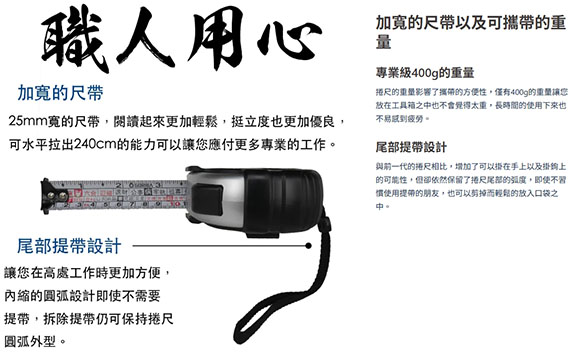 全長為8m寬度25mm,安全可靠的自動煞停設計,正面印有公制(公分)以及台尺,上半部為文公尺,下半部為丁蘭尺,耐磨超厚挺立度絕佳,日本JIS 1級等級精準度,附有強力磁鐵的尺頭鉤,附提帶掛勾