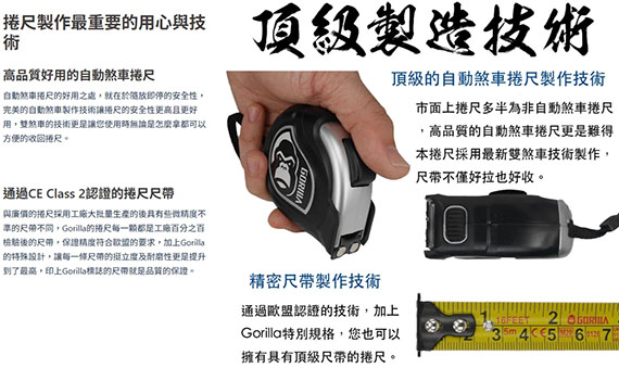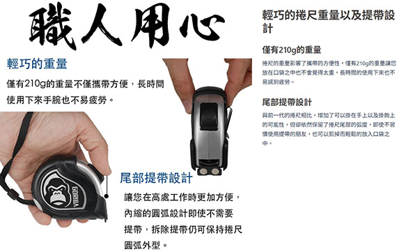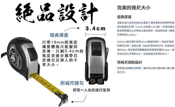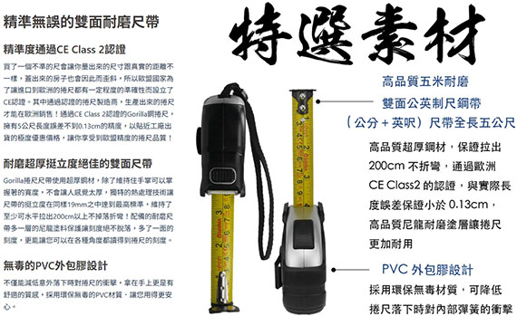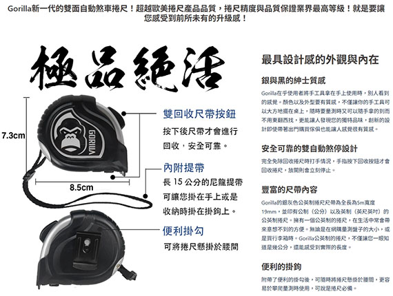 【上一個】【下一個】 | GORILLA 雙面自動煞車 5M19mm 銀灰 公英制捲尺 002-G016