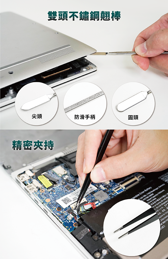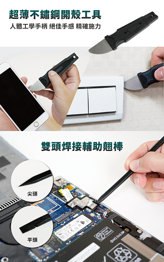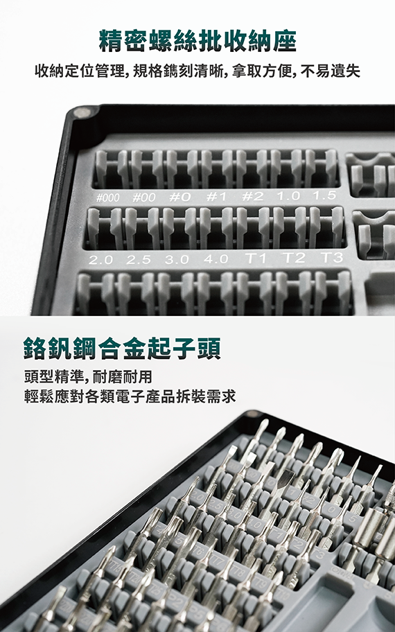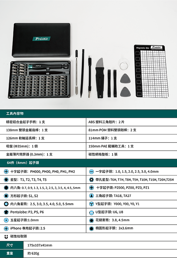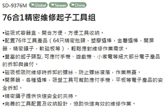 配置76件工具產品(64只精密批頭、塑膠撬棒、金屬撬棒、開屏器、精密鑷子、軟磁板等),可應付絕大部分電子產品的拆卸與鎖付,磁吸式容器盒,鋁合金手柄,鉻釩鋼合金起子頭,萬向彎曲軟軸