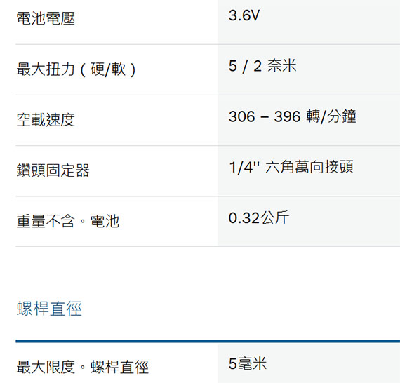 最大扭力(硬/軟):5/2Nm、空載速率306-396rpm、通用起子頭固定、七段扭力設定座、環狀LED燈、新一代機械離合器、3.6V電池電壓、內建2.0Ah鋰電池、優化的按壓按鈕、USB-C充電接口、內含配件:充電線(1607000EW0)、8件式螺絲起子頭組(2607002834)、延伸工具頭固定座(1600A013UM)、收納盒(1600A02E8P)
